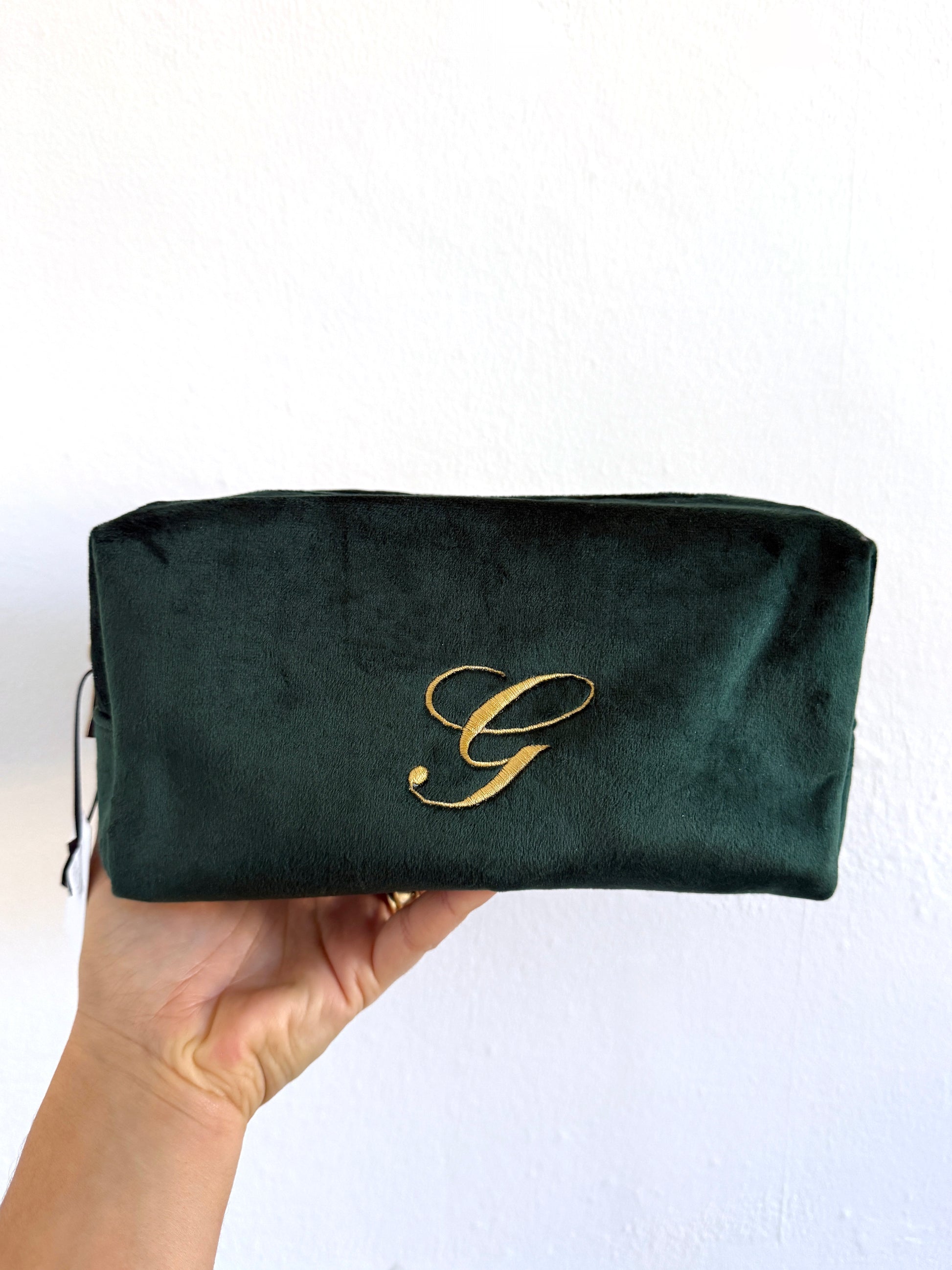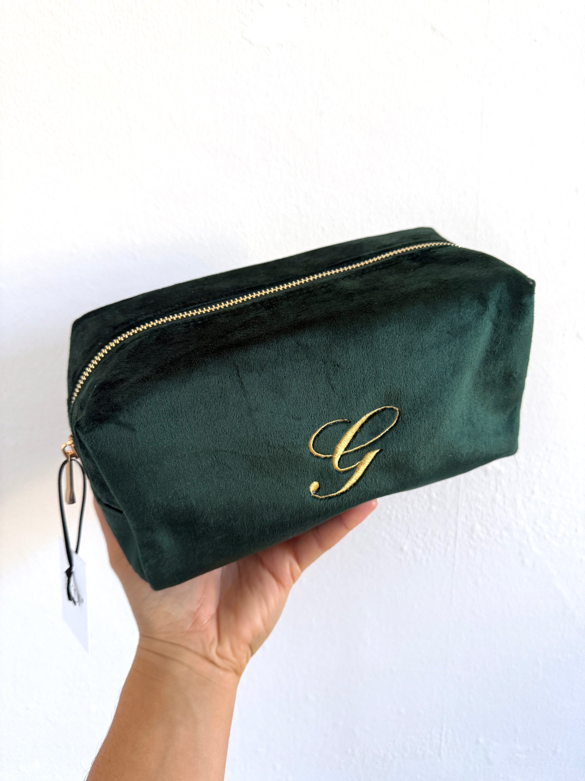 Beauty in velluto verdone da personalizzare con iniziale ricamata a macchina nel colore che vuoi! Chiusura con zip.