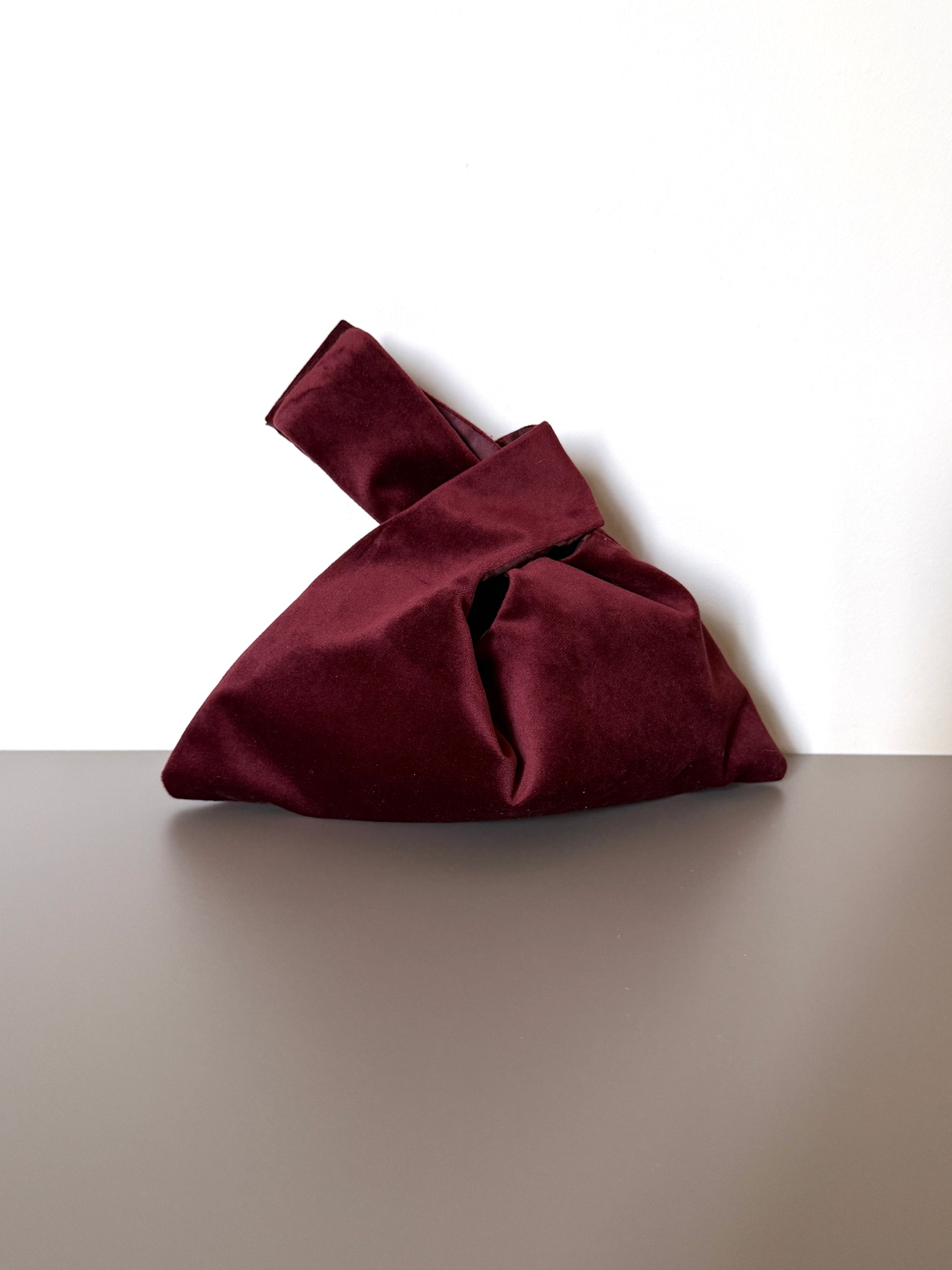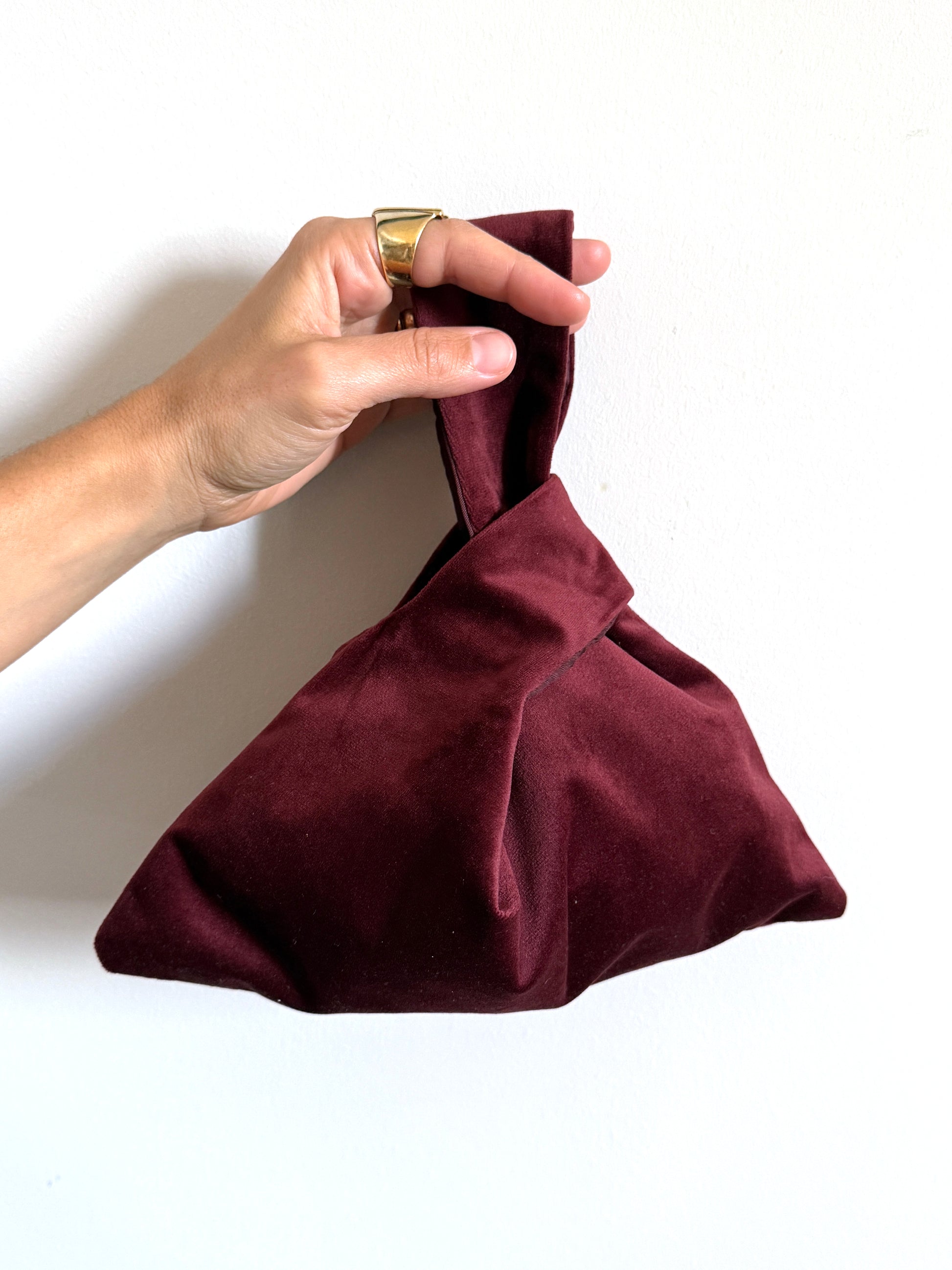 Borsa in velluto di cotone con fodera interna. Chiusura a nodo giapponese. Pratica e super capiente! Prodotto 100% made in Italy.