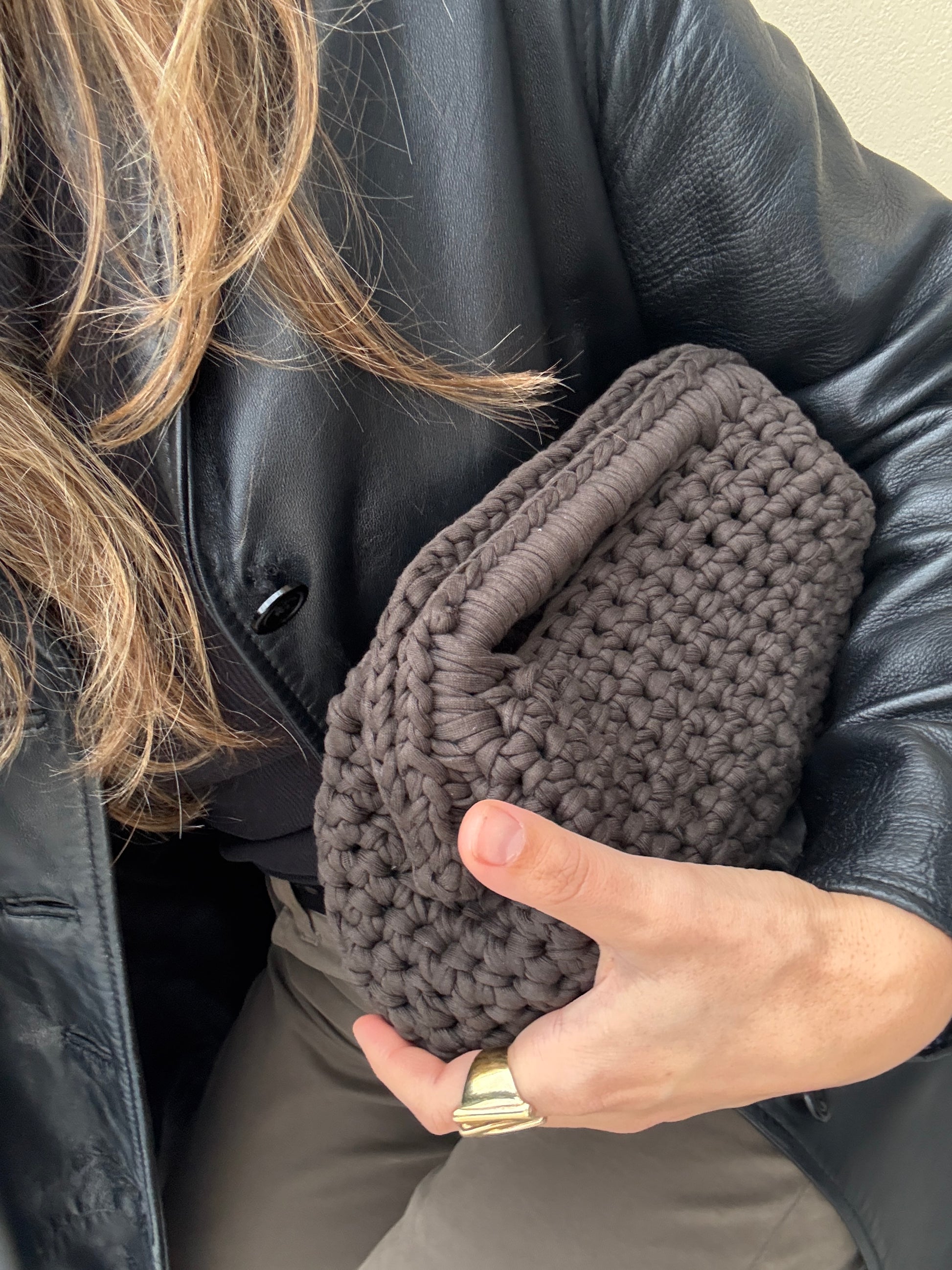 Clutch artigianale in fettuccia lavorata con la tecnica crochet. Prodotto 100% made in Italy.
