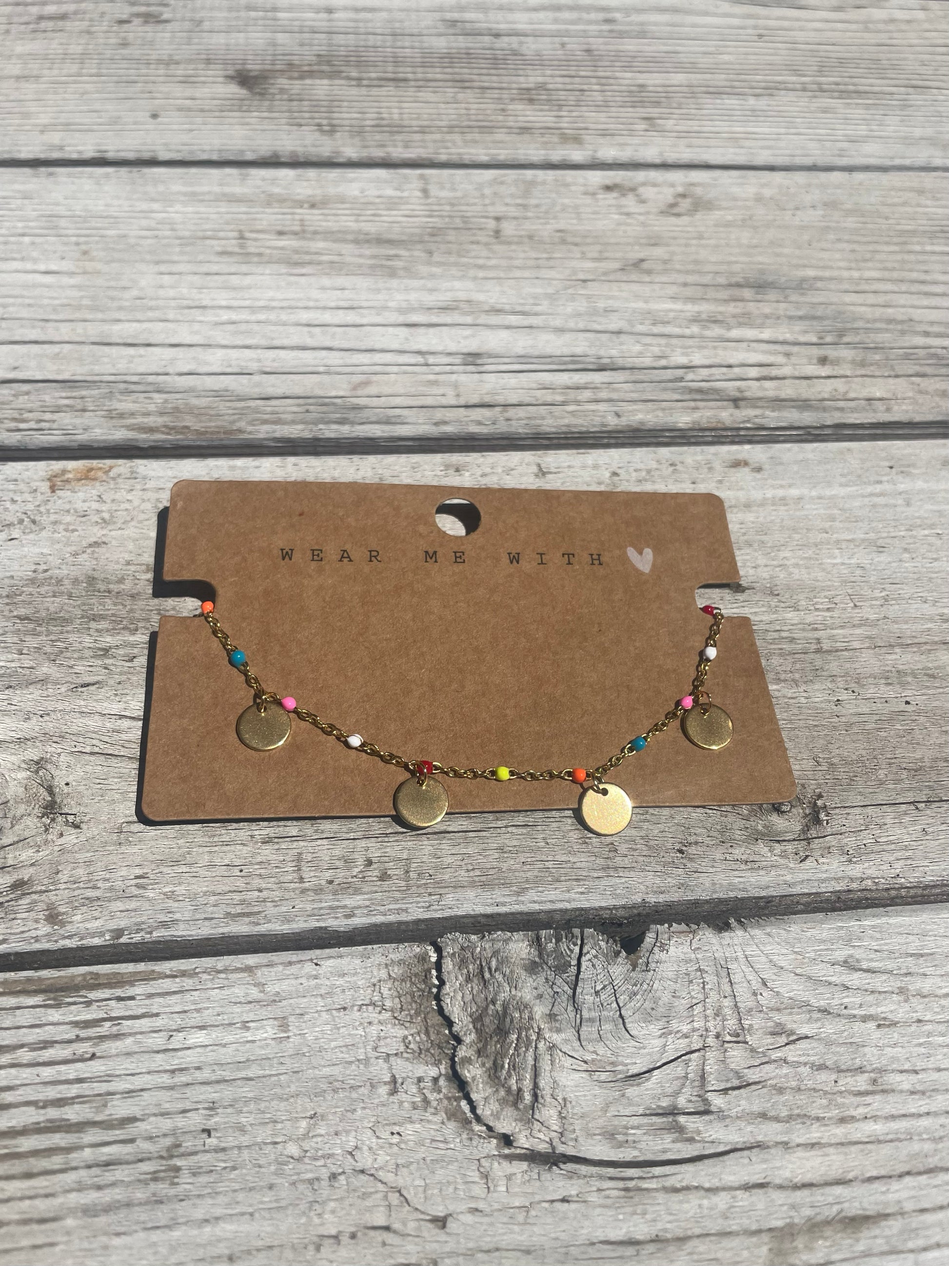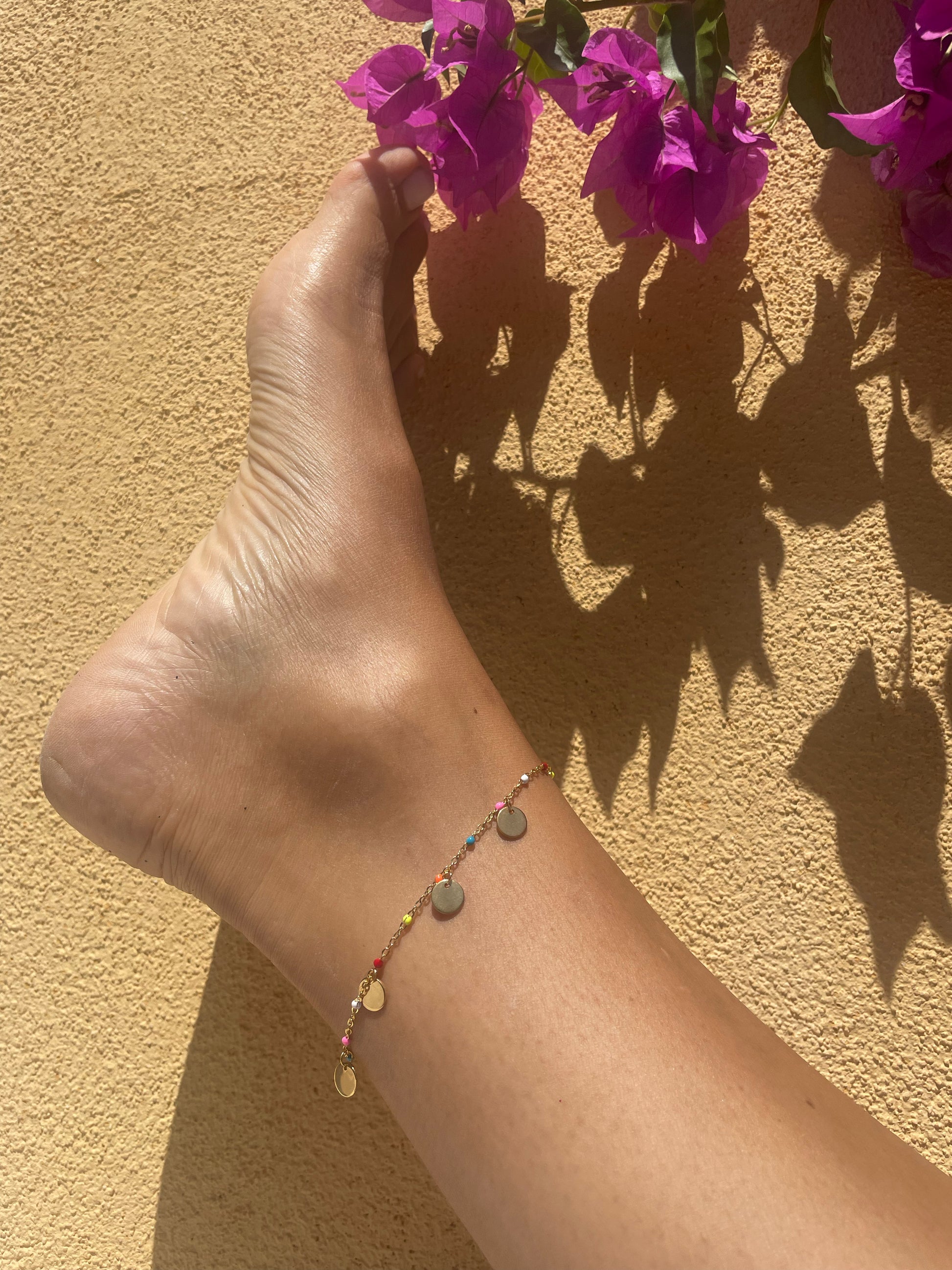 Cavigliera con perline colorate e inserti in acciaio inox color oro. 100% waterproof.