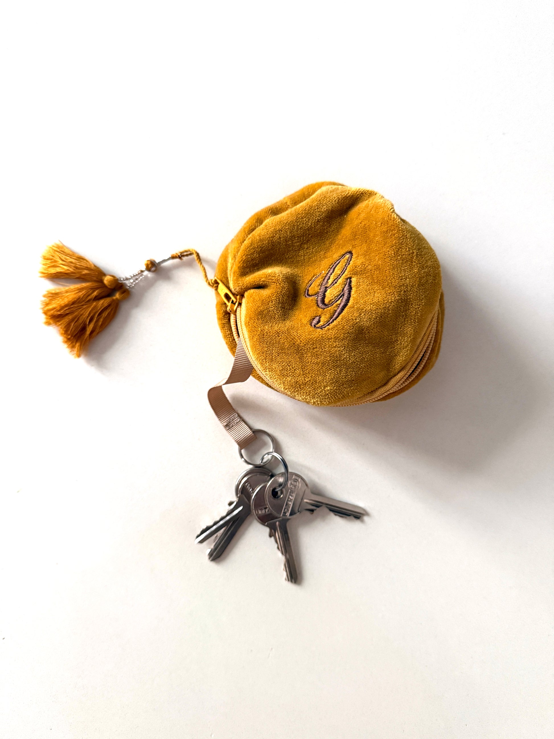 Portachiavi in velluto esterno e fodera in cotone stampato a contrasto. Chiusura con zip. Fettuccia interna dotata di portachiavi.