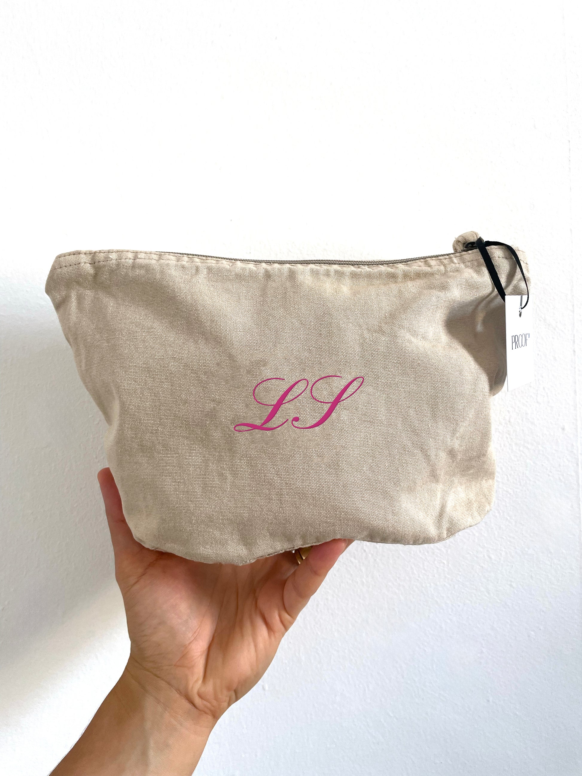 Set composto da sacca a righe bordeaux in cotone Bio + beauty personalizzabili.