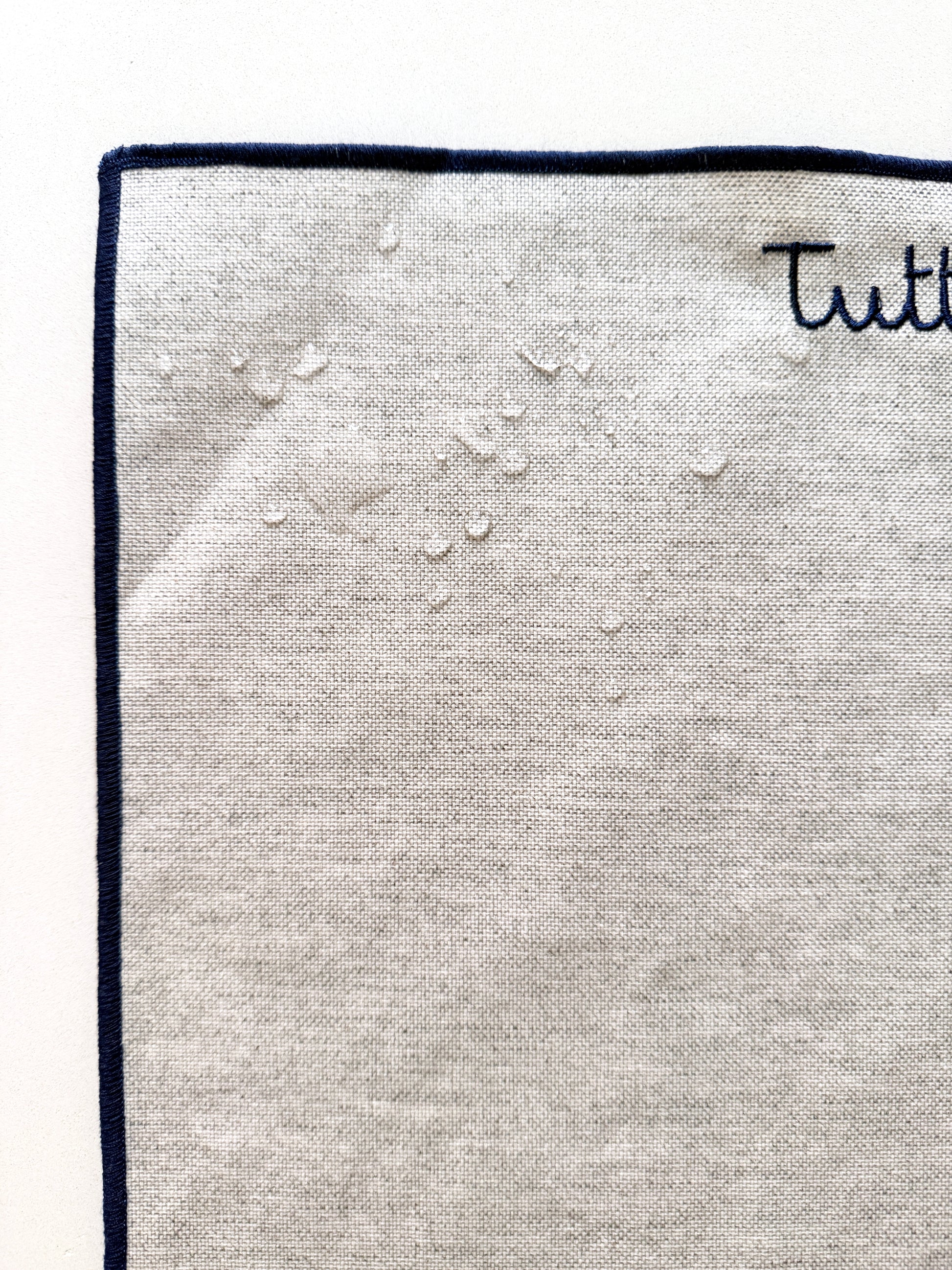 Tovaglietta antimacchia con bordo blu e frasi multisoggetto ricamate a macchina.
