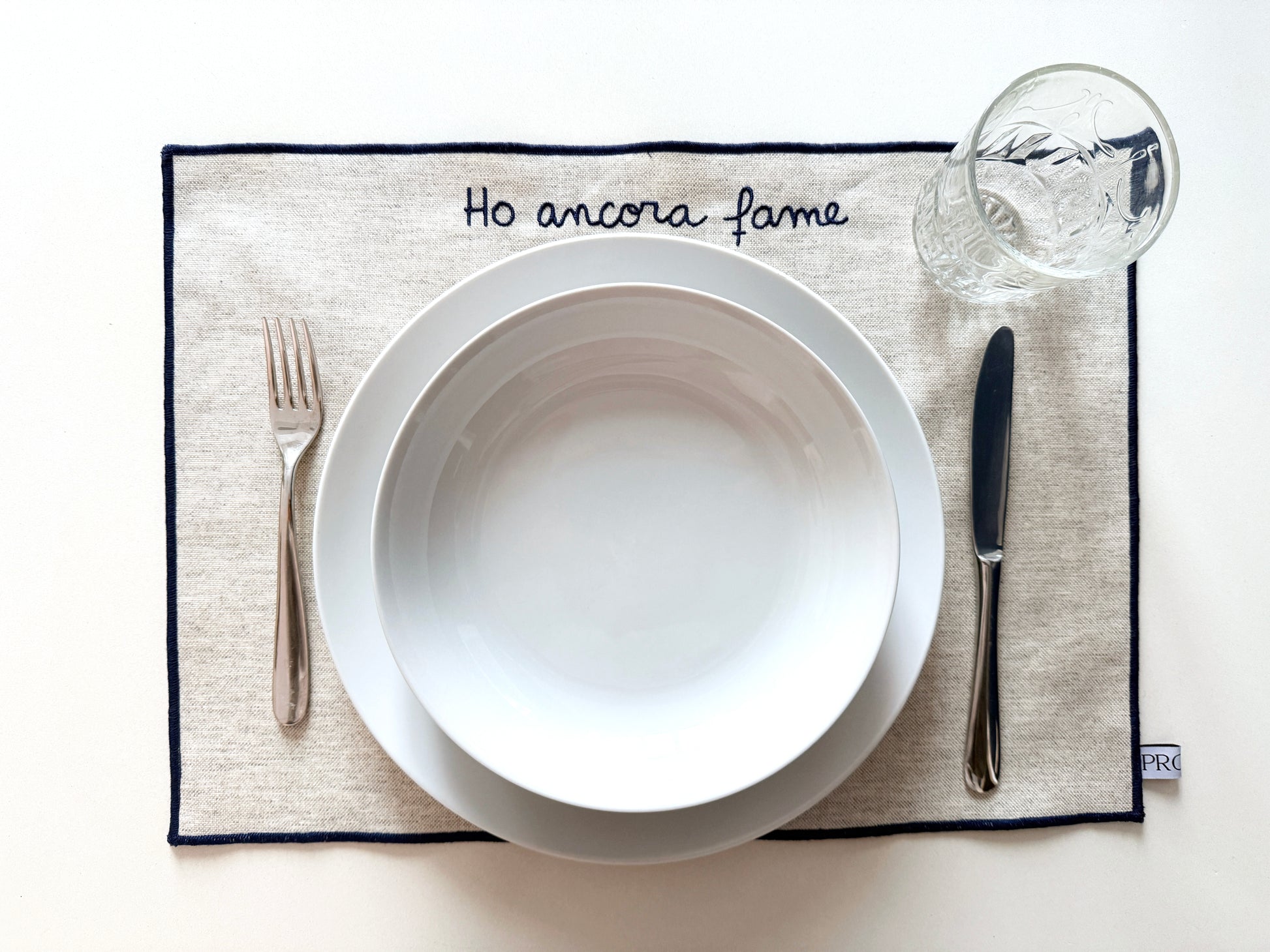Tovaglietta antimacchia con bordo blu e frasi multisoggetto ricamate a macchina.