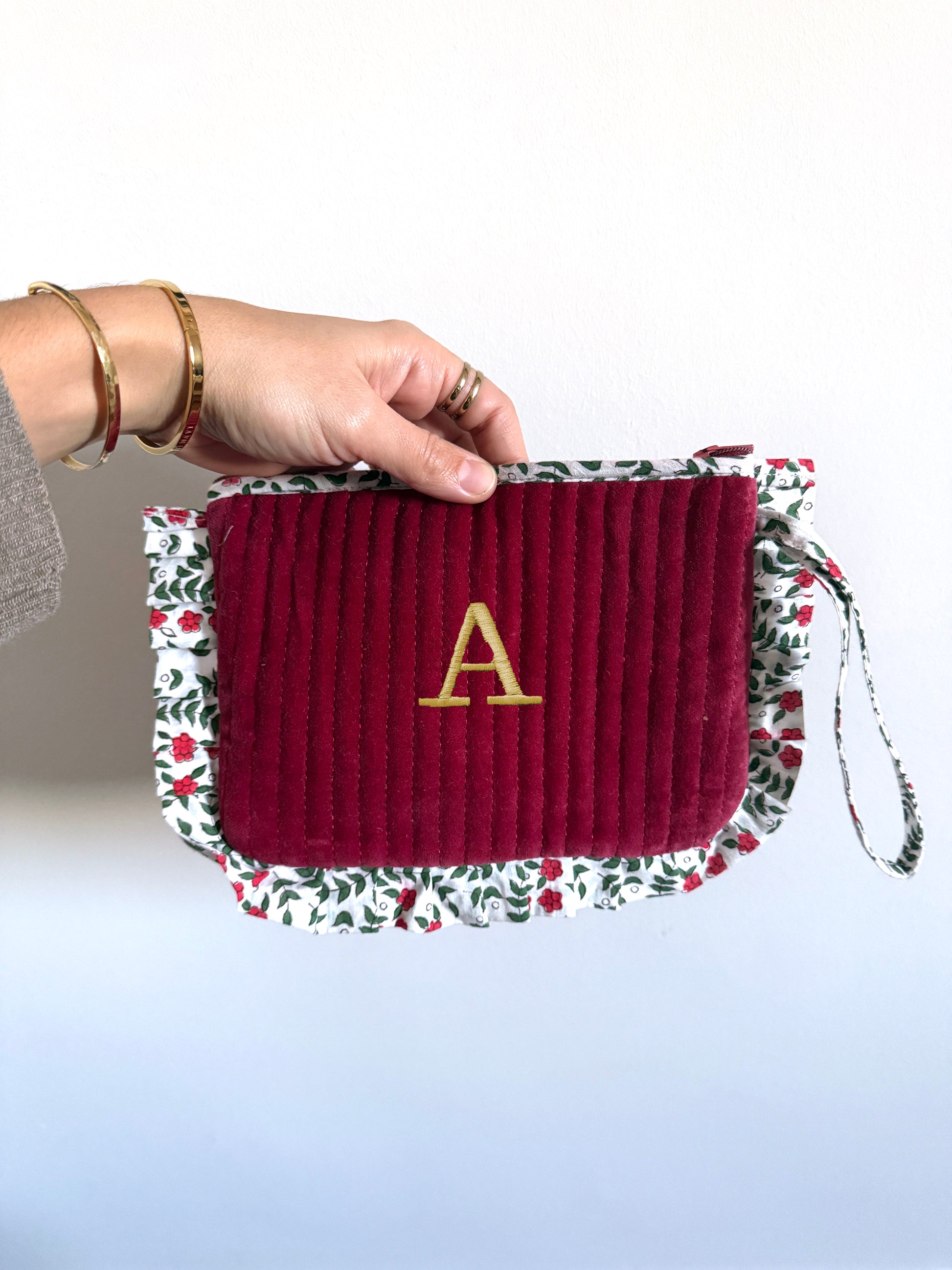 Pochette con manico in velluto esterno e fodera in cotone stampato a contrasto . Chiusura con zip.