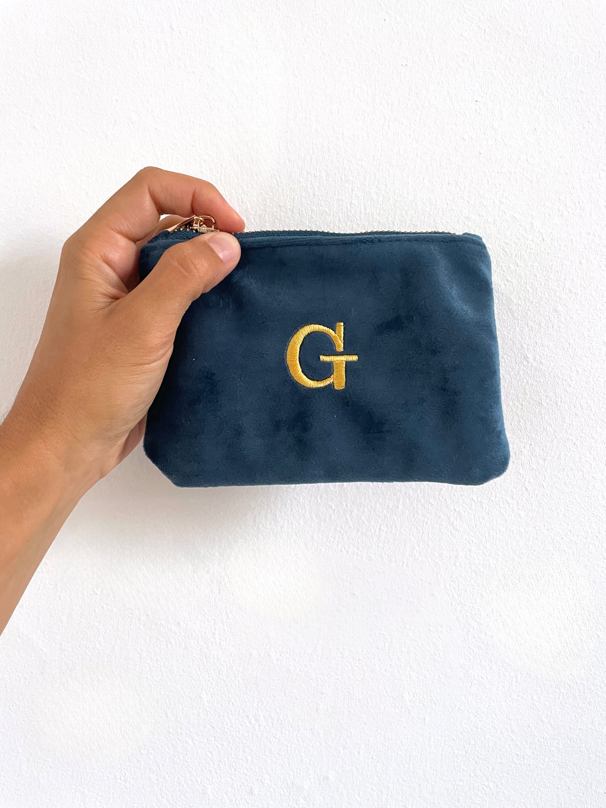 Pochette in velluto blu da personalizzare con iniziale ricamata a macchina nel colore che vuoi! Chiusura con zip.