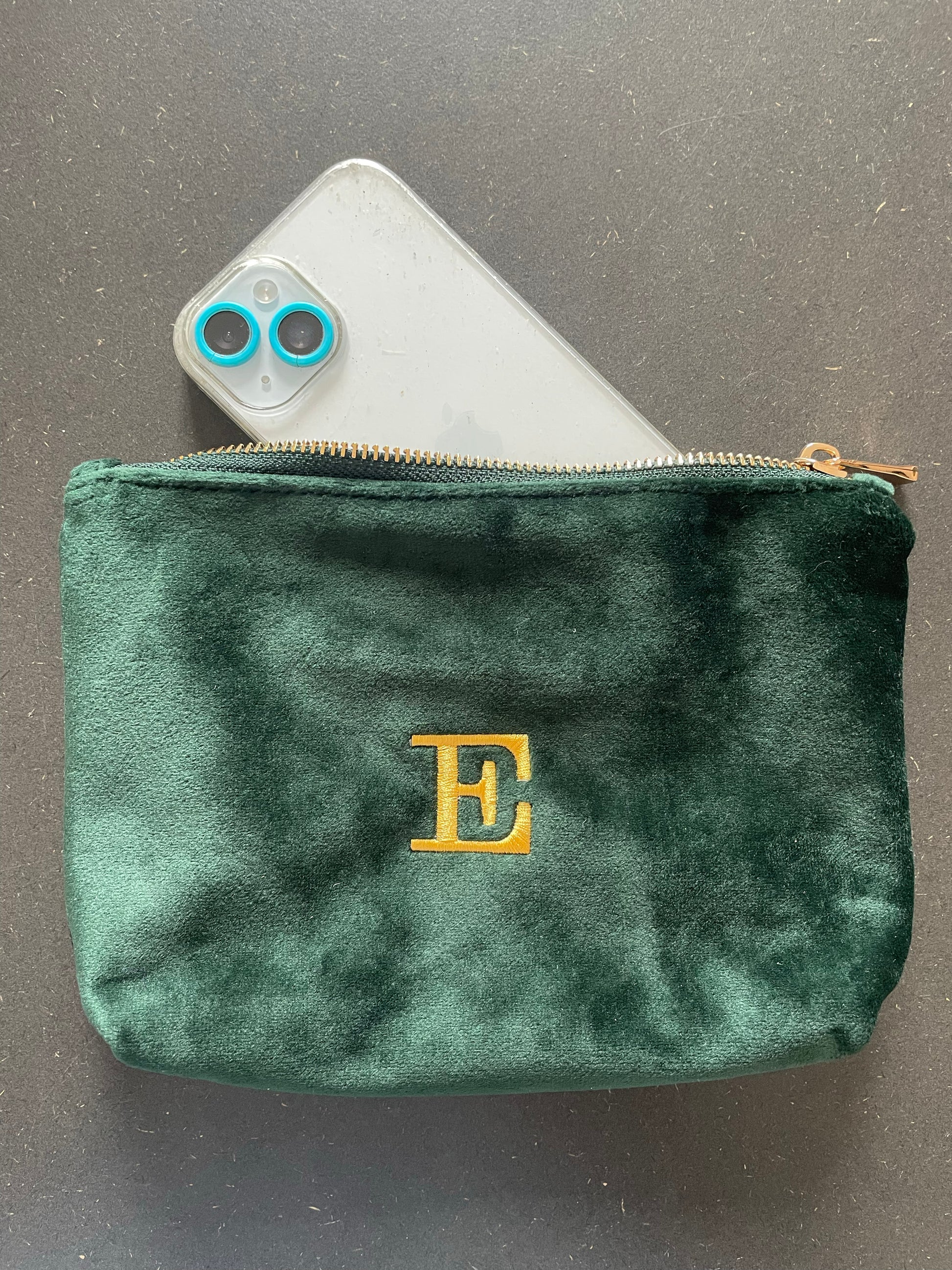 Pochette in velluto verdone da personalizzare con iniziale ricamata a macchina nel colore che vuoi! Chiusura con zip.