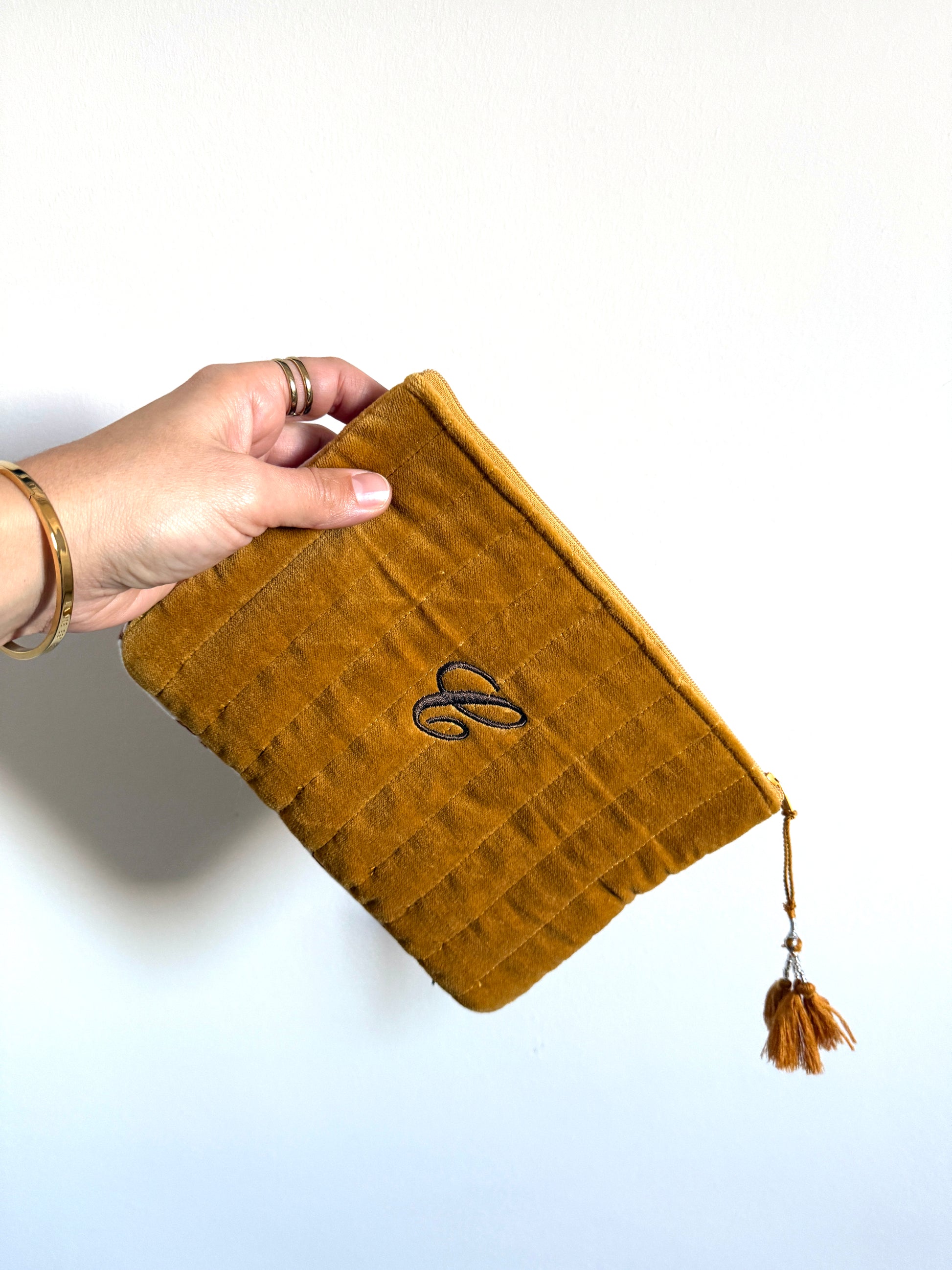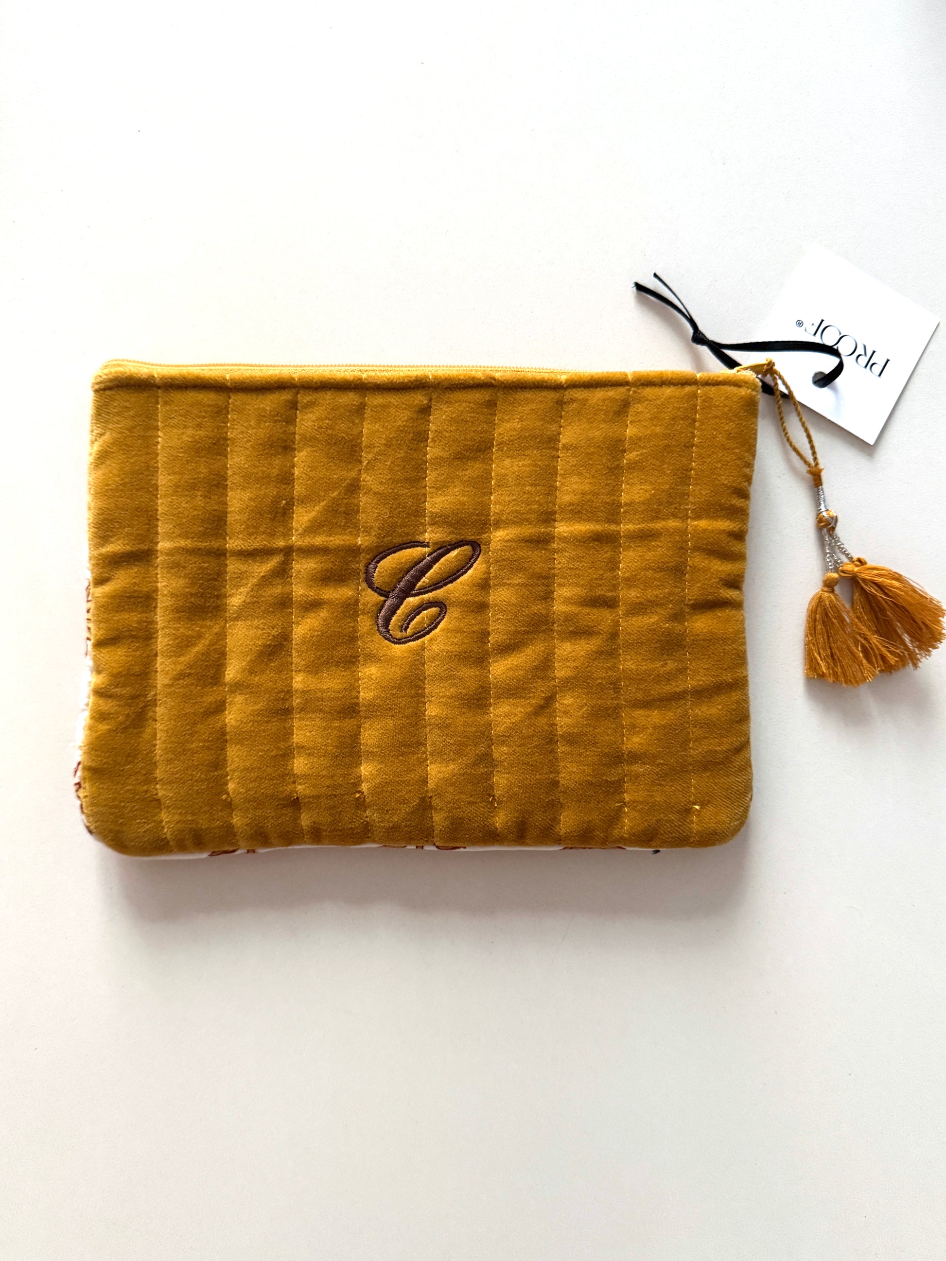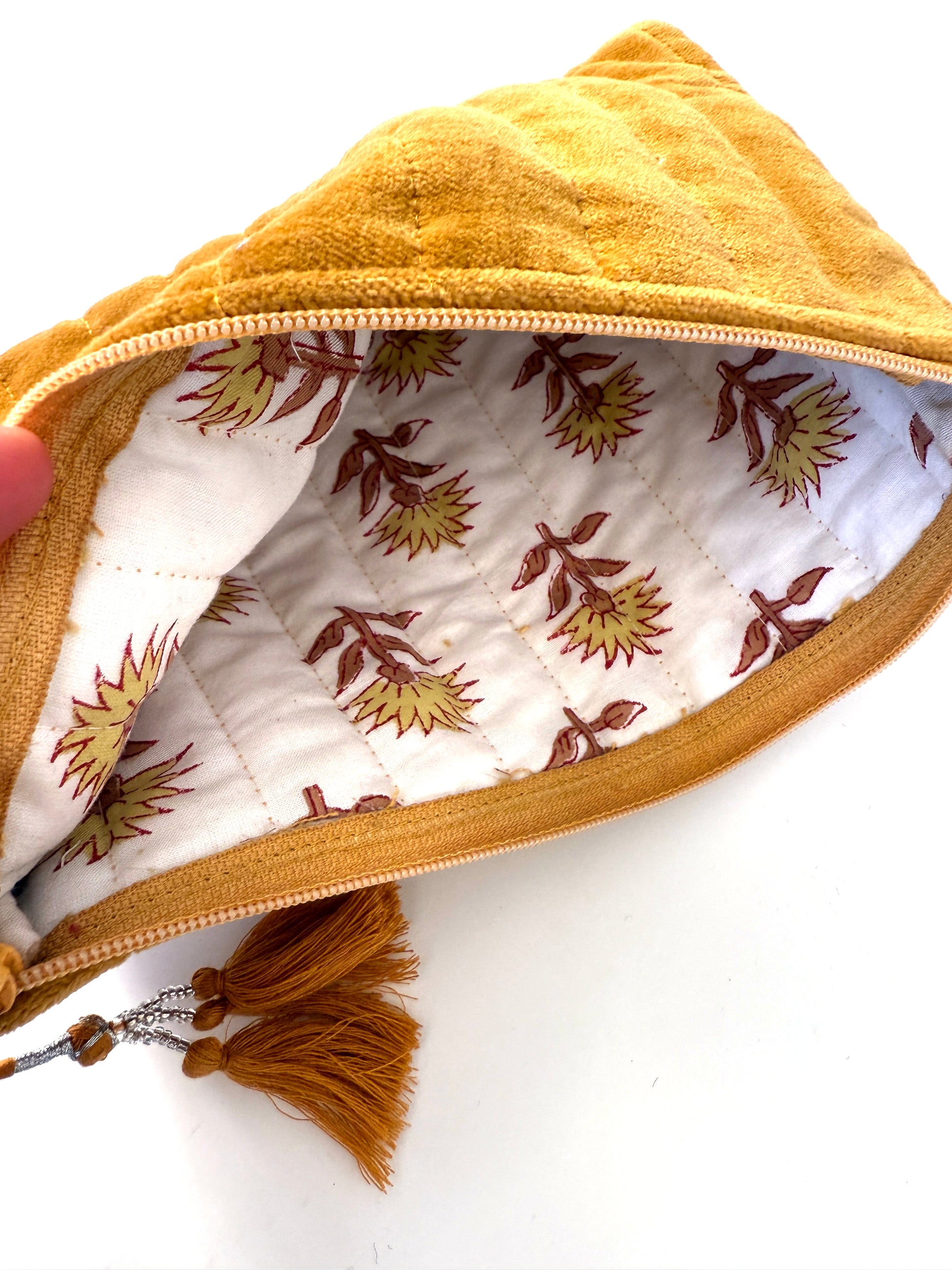 Pochette in velluto esterno e fodera in cotone stampato a contrasto. Chiusura con zip.